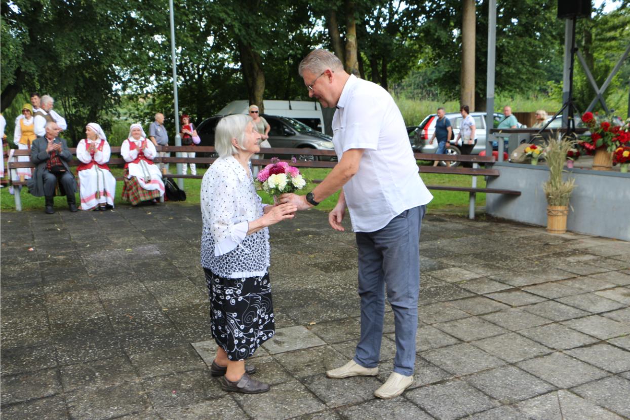 Pelėdnagių seniūnas Edvinas Pagirskas labūnaviškei Onai Mačijauskienei įteikė puokštę gėlių./Akvilės Kupčinskaitės nuotr.