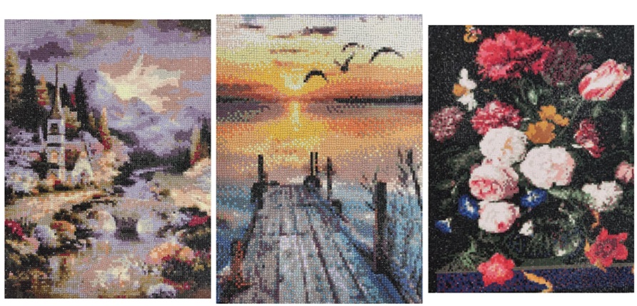 Čia piešinys sužymėtas taškeliais ir skaičiais, į kurių vietas su specialiu pieštuku reikia suklijuoti skirtingų spalvų akmenukus. Vieną paveikslą sudaro apie 16 000 akmenukų.“
