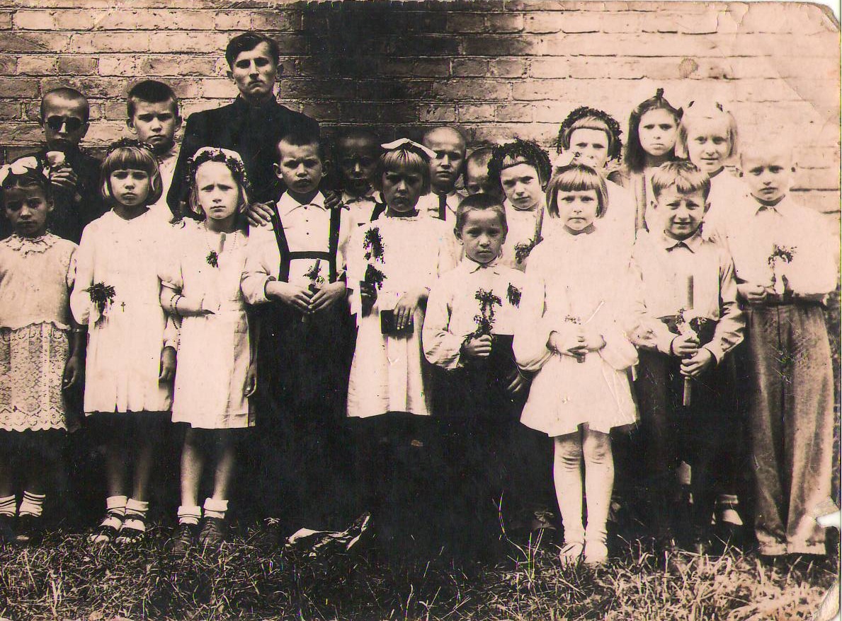 Pirmoji Komunija Krakėse. Vaikai su klieriku Dockumi. Ignacas – antras iš dešinės, 1944 metai./Asmeninio archyvo nuotr.