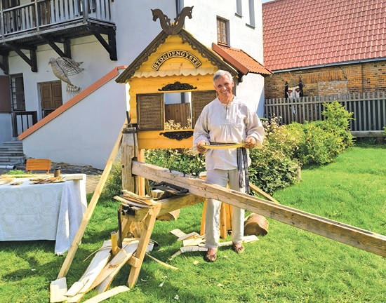 Arnetų namų kieme savo amatą pristato girininkijos specialistas Gintas Čekauskas, dirbantis Lekėčiuose, kurie garsūs kasmetiniais Mėlynių festivaliais. Jis parodo, kaip rankiniu būdu gaminamos stogui dengti reikalingos skiedros. Ir čia Gintas ne tik pademonstruoja kaip tai padaryti greitai ir profesionaliai, bet dar praveda ir pamokėlę apie medieną. Pasirodo, kad stogams dengti senovėje, o ir dabar, pirmoje vietoje karaliauja pušis, antroje drebulė, o eglė liko trečioje vietoje, nes ji nėra atspari ultravioletiniams spinduliams. O kodėl liko nepaminėti mums gerai žinomi lietuviški alksnis, uosis, ąžuolas? Todėl, kad žmonės kirto tai, kas augo arčiausiai namų ir tų medžių buvo daugiausiai, o ąžuolas jiems buvo tiesiog per brangus. Likę medžiai tinkami tik vidaus sienoms ir baldams.