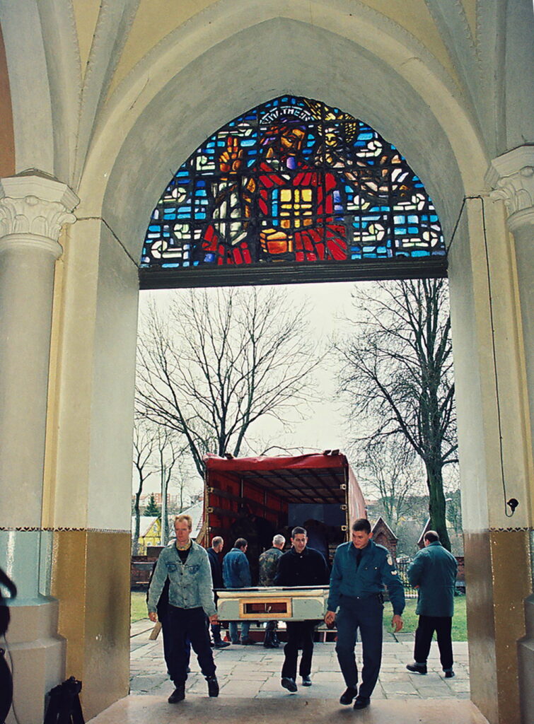 Griežykla – vargonų smegenys (joje sumontuotas registrų ir manualų valdymas) – labai daug sverianti instrumento dalis – netilpo pro bažnyčios duris, nešti laiptais buvo neįmanoma, nuspręsta kelti iš apačios į vargonų balkoną. AB „Anykščių vynas“ darbininkai rąstais tempė ją nuo bažnyčios grindų iki pat vargonų balkono.