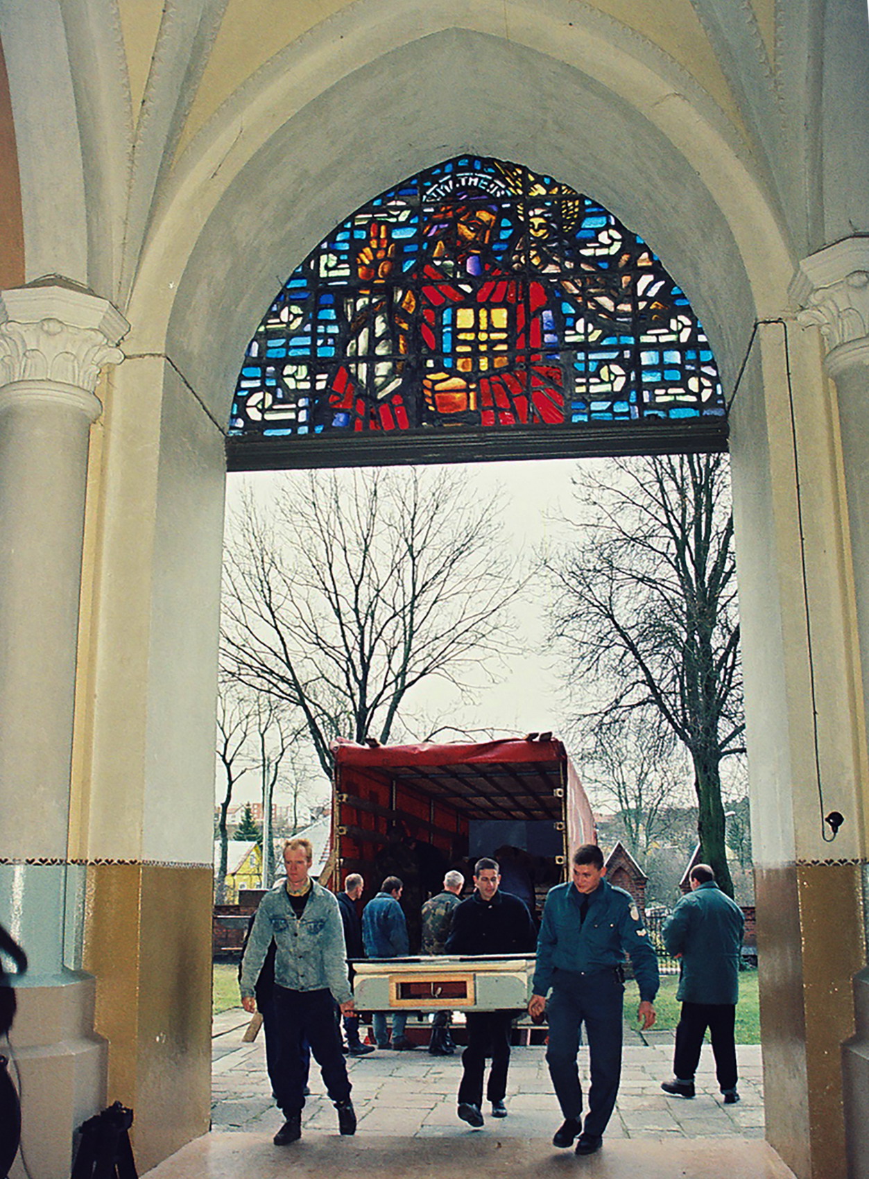 „Į Anykščius buvo atvažiavusi deleguota komisija: Balstogės arkivyskupas Voicechas Ziemba, Drohičino vyskupas Antoni Pacyfik Dydycz OFM Cap iš Lenkijos, Panevėžio vyskupas Juozas Preikšas, kun. Vaclovas Aliulis, MIC, prel. Juozas Pečiukonis iš Marijampolės – apžiūrėti erdvinės kompozicijos dermės tarp vyskupo A. Baranausko paminklo ir Šv. apaštalo evangelisto Mato bažnyčios. Paskui visi, užėję į bažnyčią, stebėjosi, kad navose daug dėžių. Paaiškinau, kad išmontuoti seni vargonai, o dėžėse dar buvo naujųjų vargonų vamzdžiai ir detalės. „Tėveli, kur pastatyti mažuosius vargonus, nes tai bažnyčios turtas“, – kreipiausi į buvusį seminarijos vicerektorių, garbų dvasios Tėvą, eruditą V. Aliulį, MIC. (Vargonų meistrai siūlė statyti tarp kolonų, tačiau patarimai nelabai tiko.)